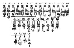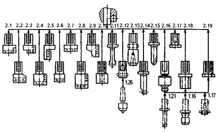 Рис. 10.15. Компонування інструментального спорядження багатоцільових верстатів Цангові патрони 1.4-1.6 призначені для встановлення та закріплення торцевих фрез та інших різальних інструментів з циліндричними хвостовиками діаметром 5...20 і 20...40 мм. Надійність закріплення інструментів забезпечується за допомогою цанг зі збільшеною кількістю її пелюстків (до 8... 12). Це підвищує еластичність цанги та зменшує зусилля, які необхідні для деформування її пелюстків. Кут нахилу конуса цанги забезпечує самогальмування. Перехідна втулка 1.5 з конусністю 7: 24 призначена для встановлення торцевих фрез, а перехідні втулки 1.7 і 1.8 — для встановлення та закріплення різальних інструментів 1.26-1.29 з конусами Морзе 2, З чи 4. Держаки 1.9 разом зі втулками, оправками та патронами 1.16-1.25 забезпечують просте та надійне регулювання виступів різальних інструментів (свердел, розвертачок, зенкерів і мітчиків). Оправки 1.10 та 1.11 призначені для попереднього, а оправка 1.12 — для остаточного розточування отворів. Оправка 1.13 забезпечує встановлення та закріплення підрізувальних пластин, а двозуба головка 1.14 та універсальна головка 1.15 — розточування отворів. За допомогою спеціальних допоміжних інструментів у комплекті з держаками регулюють виступи різальних інструментів. Патрони цангові забезпечують встановлення та закріплення різальних інструментів з циліндричними хвостовиками діаметром 5...25 мм (свердла, зенкери, фрези тощо). Патрони мають циліндричний регульований хвостовик діаметром 36 чи 48 мм, що фіксується у держаку. Регульовані оправки 1.19 призначені для встановлення насадних зенкерів і розвертачок з конусністю інструментальних хвостовиків 1:30. Циліндричний регульований хвостовик має діаметр 36 або 48 мм. Регульовані різьбонарізальні патрони 7.20, що призначені для нарізування різьб М6...М16, мають запобіжні пристрої, регульований хвостовик діаметром 36 чи 48 мм і допускають встановлення та закріплення дискових фрез. Закріплюють і регулюють виступи різальних інструментів з конусами Морзе за допомогою регульованих самовстановних втулок із внутрішнім конусом Морзе. Таке призначення мають трикулачкові патрони 1.27 без ключа з конусом Морзе 2 та діаметром свердел 3...16 мм і різьбонарізальні патрони 1.27 із запобіжними пристроями для нарізання різьб М6...М16.