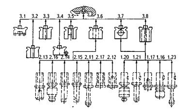 У перехідній втулці 2.10 встановлюють різальний чи перехідний допоміжний інструмент з циліндричним хвостовиком 16...40 мм у діаметрі. Держаки 2.11 призначені для встановлення перових свердел, а перехідна жорстка втулка 2.12 і патрон 2.13 зі самовстановною втулкою — для встановлення різального інструмента, що має хвостовик з конусом Морзе. Різцедержаки чи борштанги 2.14 і 2.15 дають змогу встановлювати різці для розточування глибоких отворів діаметром 70...250 мм, а патрон 2.16 — мітчиків для нарізання різьби. Застосування спеціальної вставки для патрона забезпечує нарізання різьби плашками. Перехідна розтискна втулка 2.17 призначена для закріплення різального інструмента з циліндричним хвостовиком 8...32 мм у діаметрі, а перехідні втулки 2.18 і 2.19 -і діаметром отворів 36 і 48 мм відповідно дають змогу використовувати на токарних верстатах різальний інструмент, призначений для свердлильних, розточувальних і фрезерних верстатів. Застосування такого комплекту допоміжного інструмента з циліндричним хвостовиком дає змогу зменшити номенклатуру допоміжного інструмента для токарних верстатів з ПК порівняно з універсальними інструментами приблизно удвічі. Схема компонування інструментальних блоків з призмою для базування заготованок і різним розміщенням пазів для встановлення різців зображена на рисунку 11.13. Двобічний різцедержак 3.1 значної жорсткості, який застосовують у верстатах з будь-яким розміщенням револьверної головки та напрямком обертання шпинделя, дає змогу використовувати всю потужність верстатів для виконання чорнових операцій. Різальний інструмент з поперечним перерізом 16 х 16...40 х 40 мм може бути встановлений у відкритих чи закритих пазах. Його попередньо налагоджують поза верстатом у різцедержаку за допомогою регулювальних гвинтів. Жорсткий різцедержак 3.2 з відкритим пазом, який має праве та ліве виконання, дає змогу виводити різальний інструмент поза габарити револьверної головки, а різцедержак3.3— встановлювати у нього два різці. Універсальний трибічний різцедержак 3.5 призначений для встановлення допоміжних інструментів з циліндричним хвостовиком діаметром 30... 60 мм.
