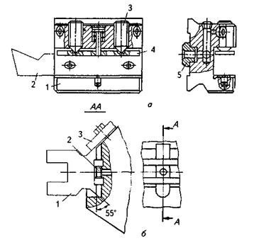 Держаки 3.7 і 3.8 також мають два конструктивні виконання й призначені для встановлення інструментів фрезерно-свердлильно-розточуваль-них верстатів з циліндричним хвостовиком діаметром 36...48 мм. Застосування блока 3.4 забезпечує зону різання змащувально-охолоджувальними рідинами. Всі різцедержаки мають уніфіковані, стандартизовані елементи, деталі та окремі вузли. У допоміжних інструментах з установною призмою точність базування та надійність закріплення самих держаків до револьверної головки (рисунок 11.14, а) забезпечується призматичними елементами довжиною 56; 72; 90; 115 і 140 мм. Різець 2 встановлюють у держак 1 та закріплюють двома гвинтами 3 за допомогою планки 4. У іншому з'єднанні різцедержака з призмою (рисунок 10.14, б) держак 1 встановлюють у револьверну головку з базуванням на нижню та бічну поверхні призми, фіксують відносно паза револьверної головки сухарем 2 та закріплюють планкою 3.
