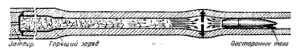 При нажатии на спусковой крючок шептало освобождает боевой взвод поршня (7), который под действием боевой пружины (6) с большой скоростью движется вперед, сжимая воздух в воздушной каморе (4) ство-льной коробки (8). Через воздухопровод (3) давление воздуха (9-показано стрелками) действует на пулю (2), закрывающую канал ствола (1) – и, когда это давление достигнет необходимого давления форсирования (Pф), то пуля начнет двигаться по каналу ствола с большим ускорением поряд- ка 200 м/с2. Скорость пули будет возрастать до максимальной (Vм) , пока сопротивление ее движению не уравняется с силой давления сжатого воздуха, которая будет постепенно уменьшаться до атмосферной (Pатм) из – за падения давления за пулей в канале ствола в связи с увеличением после-пулевого пространства. При выстреле из пневматического оружия нет 2-го периода. Во время выстрела при попадании в ствол посторонних предметов(кусочек пакли, льдинки, даже застывшей капли ружейной смазки) может произойти раздутие канала ствола и даже его разрыв из-за тор-можения пули и резкого возрастания давления до величины, превышающей предел прочности ствола.