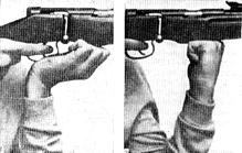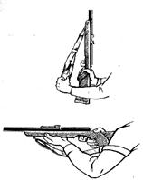 б) в) г) Рис. 102. Схема изготовки для стрельбы стоя с изогнутым и закрученным корпусом 4. Кроме изгиба корпуса вправо – вбок и в спине тело можно “ закручивать ” путем разворота стоп от положения на Рис. 102а - вправо на 3-5° с последующим поворотом туловища влево на тот же угол для возвращения оружия в первоначальное направление (Рис. 102г - вид на стрелка сверху), при этом плоскость стрельбы должна пересекать обе стопы примерно посредине. С “закручиванием” можно выполнить не более 10 выстрелов подряд без ущерба для точности стрельбы, затем следует вернуться к обычной изготовке. 5. Левая рука согнута и локтем упирается в подвздошный гребень таза или же немного правее его – в косую мышцу живота, а при длинном туловище или коротких руках плечевая кость должна очень плотно прижиматься к груди и удерживаться на ней за счет сил трения, без опоры. Произвольная винтовка, как на Рис.102, удерживается обычно за “шампиньон”, другие виды винтовок – как показано на Рис. 103.