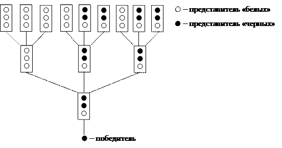 Пусть имеется 2 коалиции: «черные» (8 человек) и «белые» (19 голосов). Возможна следующая многоступенчатая система голосования:
