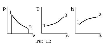 Большое значение для теоретических исследований и решения практических задач имеют так называемые изопараметрические процессы, протекающие при постоянном (фиксированном) значении одного из параметров состояния и адиабатный процесс, который протекает без теплообмена с окружающей средой. Термодинамические процессы удобно иллюстрировать в виде соответствующих линий (кривых) процесса на двумерных фазовых диаграммах. Широкое распространение имеют pv-, Ts-, hs -диаграммы, которые условно показаны на рис. 1.2.