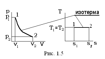 В уравнении политропного процесса T×vn-1= const, условие Т= const удовлетворяется при n = 1, а теплоемкость для этого случая определяется из выражения Из уравнения состояния p×v=Rг×T (при условии T= const) следует p×v=Rг×T = const, pv = p1 v1 = p2 v2Þ p1 v1= p2 v2. Перечень величин (1.37) в изотермическом процессе взаимосвязан следующими соотношениями: