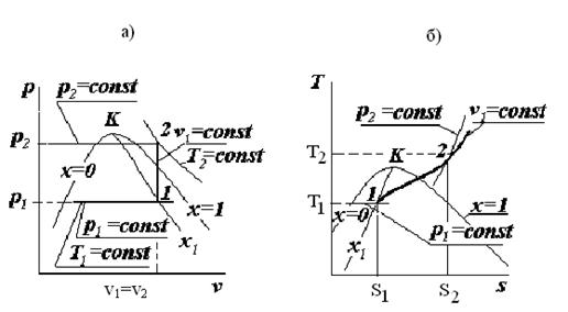 2. Изобарный процесс. P = const, dp = 0, приведен на рис. 2.5. Исследуем процесс 1-2. Дано: р1, v1, v2, (p2 = p1). Необходимо найти: х1, Т1, Т2, s1, s2, h1, h2, l1-2, q1-2.