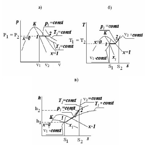 Изопараметрические процессы изменения состояния водяного пара в pv -, Ts - и hs - диаграммах