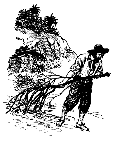 MY barley ripened and was ready to be harvested. I had neither scythe nor sickle to cut it down. But you will remember that I had two old swords which I had found in the ship. With one of the swords I cut off the heads of the barley and dropped them into a big basket I had made. I carried these heads into my cave and thrashed out the grain with my hands. When all my harvesting was done, I measured the grain. I had two bushels of rice and two bushels and a half of barley. This pleased me very much. I felt now that I should soon be able to raise grain enough for food. Have you ever thought how many things are necessary for the making of your bread? You have nothing to do but eat the bread after others have made it. But I had to sow, to reap, to thrash, to grind, to sift, to mix, and to bake. To do all these I needed many tools. I had no plow to turn up the ground. I had no spade nor shovel with which to dig it. But with great labor I made me a wooden spade, which was better than nothing. After the ground was turned up, I sowed the seed by scattering it with my hands. But it must be covered so it would grow, and I had no harrow. I cut down the branch of a tree, and dragged it over the field. This, I think, was the way that people in old times harrowed their ground. The third thing to be done was to build a fence around my field. After that came the reaping, the curing, the carrying home, the thrashing, the parting of the grain from the chaff, the grinding. I needed a mill to do the grinding. I needed a sieve to sift the flour. I needed yeast and salt to mix with the dough. I needed an oven to bake it. I had to do without the most of these things. And this made my work very slow and hard. I was very lucky in having saved so many tools from the wreck, and for this I was indeed thankful. What a hard case I would have been in if I had saved nothing at all! From time to time, as I felt the need of things I made a number of tools that served me very well. They were not such tools as you would buy at the store, but what did it matter? I have already told you about the shovel which I made from a piece of hard wood. Next to the shovel I needed a pickax most of all. Among the many things that I had saved from the wreck, I found an old crowbar. This I heated in the fire until it was almost white hot. I then found that I could bend it quite easily. Little by little I shaped it until I had made quite a good pickax of it. Of course, it was heavy and not at all pretty. But who would look for beauty in a pickax? I at first felt the need of some light baskets in which to carry my fruit and grain. So I began to study how baskets are made. It was not until I had searched almost every nook on the island that I found some long slender twigs that would bend to make wicker ware. Then I spent many an hour learning how to weave these twigs together and shape them into the form of a basket. In the end, however, I was able to make as good baskets as were ever bought in the market. I had quite a goodly number of edge tools. Among these there were three large axes and a great store of hatchets; for you will remember that we carried hatchets to trade with the savages. I had also many knives. But all these became very dull with use. I had saved a grindstone from the wreck, but I could not turn it and grind my tools at the same time. I studied hard to overcome this difficulty. At last, I managed to fasten a string to the crank of the grindstone in such a way that I could turn it with my foot. My tools were soon sharp, and I kept them so.