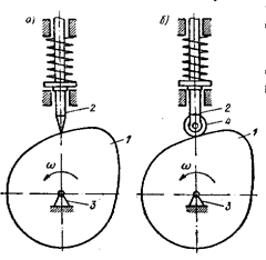 Рисунок 5.4 – Рычажные механизмы Рычажные (а), кривошипно – ползунные (б) и кулисные механизмы (в) служат для преобразования вращательного движения кривошипа в возвратно- поступательное движение исполнительного органа. Рычажные механизмы применяются в различного рода станках, кривошипно-ползунные – в поршневых двигателях, компрессорах, кулисные – в строгальных станках. Кулачковые механизмы применяются в случаях, когда перемещение, скорость и ускорение ведомого звена происходит по заранее заданному закону. Чаще всего кулачковые механизмы состоят из 3-х звеньев (рисунок 5.5, а): - 1 – кулачка; - 2 – толкателя; - 3 – стойки; - 4 – ролик (рисунок 5.5, б).