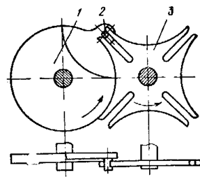 Рисунок 5.7 – Мальтийский механизм Механизм состоит из: - ведущего звена 1;: - пальца 2; - ведомого звена (креста 3). Мальтийские механизмы изготавливают с тремя, четырьмя, пятью, шестью и восемью прорезями креста, что соответствует 1/3, 1/4, 1/5, 1/6 и 1/8 оборотам ведомого звена за один полный оборот ведущего звена. Контрольные вопросы 1. Как классифицируются механические передачи? 2. Как определяется передаточное число и ККД многоступенчатой передачи? 3. Какие преимущества и недостатки фрикционных передач? 4. Какие материалы применяются для изготовления рабочих поверхностей фрикционных передач? 5. Какие устройства называются вариаторами? 6. Что такое диапазон регулирования вариаторов и как он определяется?