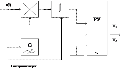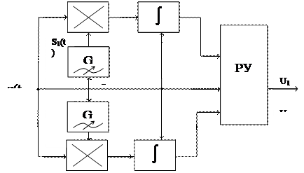 ∫ z(t)s1(t)dt > ∫ z (t)s2(t)dt, то передавался сигнал s1(t), которому соответствует первичный сигнал и1, а при обратном знаке неравенства — первичный сигнал u2. Это правило отмечено в алгоритме тем, что возле знака неравенства стоит тот сигнал (и1 или u2), в пользу которого выносится решение. Для сигналов с АМн и ФМн в алгоритмах такие же операции, но сравнение результата интегрирования проводится с порогом, равным половине энергии сигнала s1 (t) для АМн и нулевым — для ФМн. В заключение этого раздела рассмотрим схемы оптимальных приемников. Методика построения структурных схем устройств по заданному алгоритму весьма проста: необходимо реализовать операции в той последовательности, как предписано алгоритмом. Исходя из этого правила на рисунке 4.1 приведены схемы оптимальных приемников, построенные по алгоритмам таблицы 4.1. Для сигналов с ЧМн схема двухканальная (рис. 4.1,в). В каждом канале принятый сигнал z(t) умножается на копию передаваемого сигнала (s1(t)— в первом канале и S 2(t) — во втором), вырабатываемую генераторами G1 или G2. Полученное произведение интегрируется. Результаты интегрирования сравниваются в решающем устройстве РУ и на выходе РУ формируются первичные сигналы и1 или и2 в зависимости от знака неравенства. Схемы оптимальных приемников сигналов с АМн и ФМн одноканальные (рисунки 4.1, а, б) и результат интегрирования сравнивается с порогом. В этих схемах генераторы g1 и g2, вырабатывающие точные копии передаваемых сигналов s1(t) и s 2(t), синхронизируются от специального устройства. Для работы интегратора и решающего устройства также используются синхронизирующие тактовые импульсы, определяющие начало и конец интервала интегрирования и момент вынесения решения о принятом сигнале.