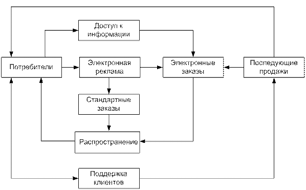 Всё большее количество товаров сегодня становится выгоднее покупать в Интернет-магазинах, которые предлагают определённые преимущества как продавцам, так и покупателям. Для покупателя это: - экономия времени при поиске товара на основе круглосуточного доступа к информации; - более широкий выбор (например, магазин Amazon предлагает более 3 млн книг); - многие софт-товары нельзя приобрести нигде, кроме как в Интернет-магазине, при этом софт-товары дают возможность получать их мгновенно, оплачивая по Сети; - возможность получить товар из любой страны мира; - выбор необходимой комплектации (сборка под заказ). Пользователь может собрать нужную конфигурацию (из представленных комплектующих) и узнать, сколько она будет стоить; - возможность разместить заказы на товары, которые ещё только готовятся к выпуску; - возможность сравнить цены нескольких производителей. Для продавца это: - возможность более гибко планировать ресурсы (заказы от покупателей поступают заранее) и лучше отслеживать бизнес-цикл; - снижение затрат на аренду помещений, рекламу, размещение заказов; - возможность расширить территорию торговли за счёт пользователей Интернета; - собственное представительство в Интернете; - снижение количества посредников. Электронная коммерция включает не только операции покупки и продажи, она обеспечивает полный замкнутый цикл (рис. 9.3), который включает элементы создания спроса на товары, распространение, услуги на послепродажное обслуживание и автоматизацию взаимодействия между партнёрами.
