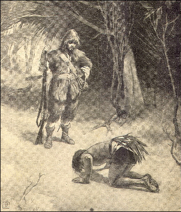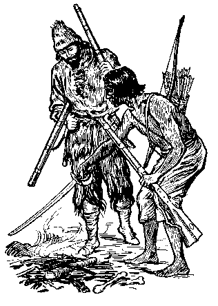 FOR a year and a half I kept close watch upon the farther shore of the island as well as upon that nearest to my castle. But not a single savage came near. One morning in June, however, I had a great surprise. I was just starting out from my castle when I saw five canoes lying high and dry on the beach not a mile away. There was not a man near them. The people who had come in them were perhaps asleep among the trees. The number of canoes was greater than I had ever counted upon seeing. For there were always four or six savages in each canoe, and there must now be between twenty and thirty men somewhere on the shore. I did not know what to think of it. I did not feel brave enough to attack so many. So I stayed in my castle and made ready to defend myself. "There is little hope of getting a savage this time," I thought to myself. I waited a long while, but heard no unusual sound. I grew tired of waiting, and made up my mind to see what was going on. So, with the help of my ladder, I climbed up to my lookout on the top of the rock. I put my spyglass to my eyes and looked down upon the beach. Surely enough! there they were. I saw no fewer than thirty naked savages dancing around a fire. I saw that they were broiling meat upon the coals, but I could not tell what kind of meat it was. As I watched I saw some of the dancers run to a boat and drag two miserable prisoners from it. They must have been in the boat all the time, but as they were lying down I did not see them. All the dancers now crowded around the poor prisoners. They knocked one of them down with a club, and then fell upon him with their knives. I supposed they were going to cut him up for their horrid feast. For a few moments they seemed to forget the other prisoner, for they left him standing alone at one side. All at once he made a break for liberty. You never saw a hound run so fast. He ran along the sandy beach, right toward my castle. I was dreadfully frightened. I thought that now my dream was coming true, and that he would surely hide in my grove. But would the other part of the dream come true? Would the other savages lose sight of him, and running another way, not come near the castle? I feared not. However, I stayed in my lookout and watched to see what would happen. I saw, to my joy, that only three of the savage followed him. He ran so fast that he gained ground on them. If he could hold out for ten or fifteen minutes, he would get away from them all. Between the savages and my castle there was the little river where I had first landed with my raft. If the poor fellow could not swim across this stream, he would surely be taken. I watched to see what he would do. To my surprise the river did not hinder him at all. The tide was up, but he plunged in and with twenty or thirty strokes was across. I had never seen a finer swimmer. When his pursuers reached the stream, he was already far away. Two of them jumped in and swam across. The other one stood still a minute and then turned softly back. It was lucky for him that he could not swim. "Now," thought I to myself, "now is the time to get me a savage!" In another moment I was down in my castle. I picked up my two guns. I was over the wall in less time than it takes me to tell about it. Never once did I think of fear. I ran swiftly down the hill toward the sea. In another minute I was between the poor captive and his pursuers. "Hello, there! Come back! I will help you," I cried. Of course he did not understand a word. But he heard me and looked back. I beckoned to him with my hand, and this he understood better. There was no time for waiting, however. The two savages that followed were close upon me. I rushed upon the foremost one and knocked him down with my gun. I did not want to shoot, lest the other savages would hear the noise and come to his rescue. The second pursuer came, running and panting, only a little way behind. When he saw me, he stopped as if he were frightened. I ran toward him, with my gun to my shoulder. As I came nearer, I saw that he had a bow and arrow and was taking aim at me. What could I do but shoot? He fell to the ground and never moved again. I now looked around to see what had become of the poor captive. I saw him standing still and gazing at me. The noise of my gun had frightened him so that he did not know what to do. I called to him: "Come here, my good fellow I will not hurt you." But of course he did not understand. Then I motioned to him with signs. He came a little way and then stopped. He came a little farther and stopped again. He was trembling like a leaf. No doubt he was afraid that he would be killed as his two pursuers had been. I spoke kindly to him and made signs that I would not hurt him. He came nearer and nearer, trembling, and kneeling down at almost every step. I smiled; I looked as pleasant as I could; I made still other signs. He came quite close to me. He laid his head upon the ground. He took hold of my foot and set it on his neck. This was his way of saying that he would be my slave forever. I took hold of his hand and lifted him up. I spoke kindly to him. Thus I at last got hold of a savage, as I had so long desired.