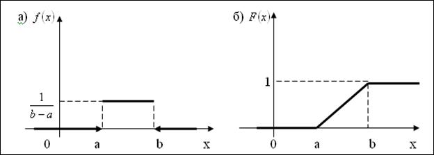 График плотности равномерного распределения изображен на рис. 1,а. На рис. 1,б представлен график функции распределения.