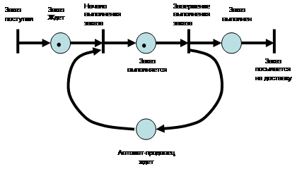 Рис.1.2. Сеть Петри для простого автомата-продавца. 3. Структура строки файла LOG.TXT должна быть следующей: - время; - наименование узла сети (переход, позиция); - функциональное назначение узла (например: «заказ ждет» или «завершение выполнения заказа»). Контрольные вопросы 1. Каково назначение компонентов ядра ОС WINDOWS? 2. Каков порядок взаимодействия компонентов ядра WINDOWS? 3. Указать расположение компонентов ядра WINDOWS. 4. Какие настроечные файлы управляют запуском WINDOWS? 5. Какая операционная система называется дисковой? 6. Что входит в состав любой операционной системы? 7. Какова роль ОС среди программного обеспечения ЭВМ?