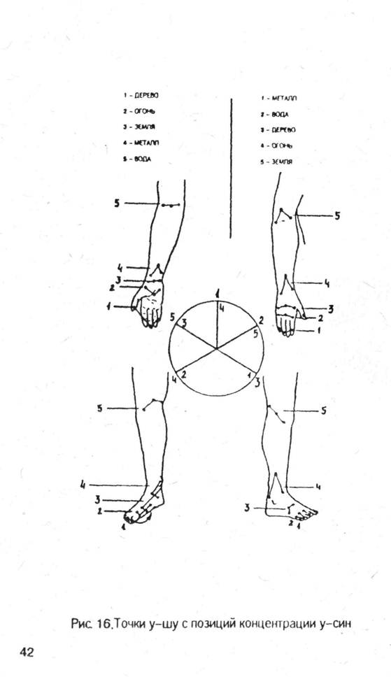 ЭНЕРГЕТИЧЕСКИЕ ИСТОКИ 2.1. Кроме инь и ян,центробежности и центростремительности, раскрытия и закрытия, различение создают энергетические истоки. 2.2. Формирование "внешней" энергии сильнее всего проявляет сямежду кончиками пальцев рук и локтями и между кончиками пальцев ног и коленями. 2.3. В число точек различения входят тонизирующая, седативная, пособник и стабилизирующий ло-лункт (см. Часть 2). 2.4. Пять точек у-шу определяют вход и течение энергии в меридиане (рис. 16): шу 1 (точка корень) - как вода из источника, течет энергия из этой точки в меридиан; шу 2 - как маленький ручеек протекает через эту точку, шу 3 - как течение реки движется энергия через эту точку, шу 4 - как бурная река несется энергетический поток; шу 5 - как река впадает в море, так и в этой точке энергия уходит в глубь тела. Точки шу 5 расположены глубоко.