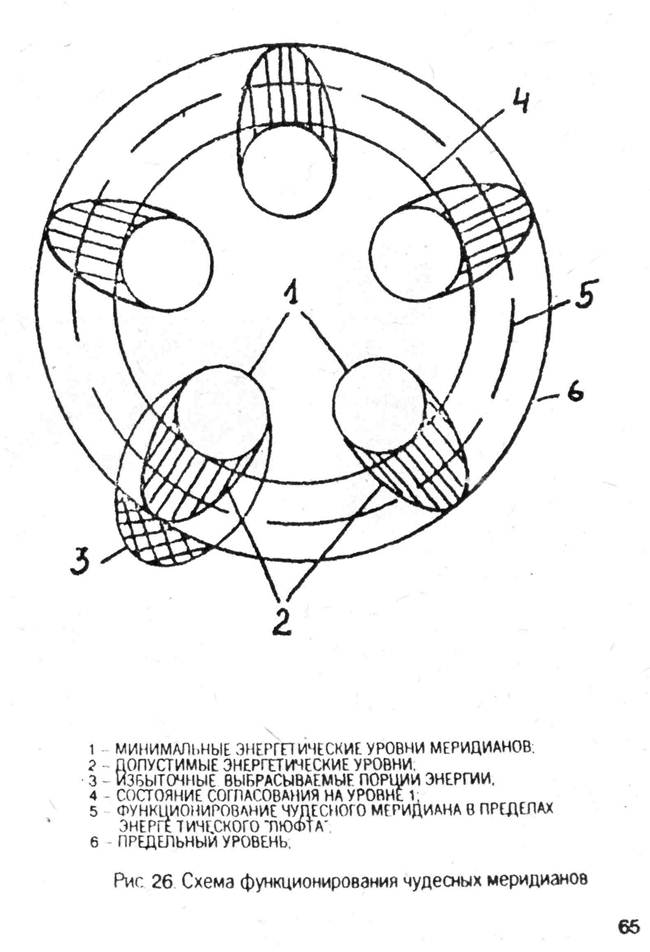 Однако поток Солнечного иня можно сформировать, используя находящиеся с тыльной стороны рук меридианы Радостного яна. Точки-источники "у-шу 1" находятся на указательном, безымянном пальцах и мизинце. "У-шу 5" расположены в районе локтя (см. рис 16). Здесь энергия уходит в глубь тела (тонкий кишечник, толстый кишечник, три обогревателя), и оттуда питает Солнечный инь. 1.4. Если в точках "у-шу 5" энергетический поток запирается, то он уходит как избыточный из организма вовне. Выход избытка энергии через руки имеет иной вид чем через голову. Здесь потоки инь, а там - ян. 1.5. Чудесные меридианы (рис 26). Понять принцип работы в энергоинформационном обмене самих групп инь и ян легко по схеме рис. 26. Минимальные энергетические уровни определяют граничное условие "безболезненного" функционирования организма. Превышение же предельного уровня ведет к выбрасыванию избытка энергии, накопленного в меридиане. Контроль над разбалансом энергии в чудесном меридиане осуществляется с позицией складывающих его постоянных меридианов. Если постоянные меридианы работают в пределах допустимого, то чудесного меридиана как бы не существует. Не существует и его точки-ключа. Если какой-нибудь постоянный меридиан выходит за пределы, то "судьями" ему становятся меридианы, составляющие чудесный меридиан. Они определяют допустимые пределы энергетического функционирования друг друга. Чтобы увеличить энергоемкость организма в режиме инь или ян, необходимо провести увеличение потенциала сразу во всей группе чудесного меридиана, связанного с назначением увеличиваемой энергии. Граничные уровни (4 и 6 рис. 26) упражняются комплексно, аса нами, энергетическим пульсом, энергетизированными "накачками". Например, "нижний" граничный уровень определяется уровнем 1 самих меридианов. Если это группа инь, то этот уровень будет зависеть от умения выключить ее, например, исполняя асану раскрытия. Верхний уровень связан с умением максимально включать, тонизированием меридианы. Диалектика здесь заключена в том. что если вы не научитесь понижать уровень 4, то напрасны будут старания в повышении уровня 6. Это замечание для тех кто стремится к "сильной энергетике".