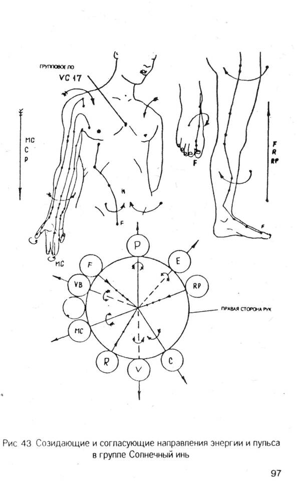 Опорой является направление хода меридиана, которое указано стрелками. Центробежный или центростремительный характер также выражен стрелками: центробежный - с оперением; центростремительный с точкой на конце стрелки. 4.5. В группе Радостный ян усиление энергетической амплитуды можно достигнуть таким же способом, но вращение по часовой стрелке идет с левой стороны (рис. 41). Зеркальные меридианы Освежающего иня выключаются вращением слева по часовой стрелке, а справа - наоборот. Отсюда подсказывается выбор асан: Дханурасана, Чакрасана, Матсиасана и др. 4.6. Высший ян выделен отдельно, так как меридиан мочевого пузыря специфичен и выражен на спине. Схемой на рис 42 повышено требование к упражняющемуся. Здесь показана не только зеркальная группа Солнечного иня, но и направление вращающегося движения энергии в меридиане тонкой кишки - оно левостороннее (с правой стороны тела). Так вы можете совершать либо комплексное движение, либо последовательное - исполняя Танец Шивы. Теперь гармоничность телесных движений определяется гармонией энергетических переходов. 4.7. Более сложные энергетические движения вы видите на рис 43. Хотя приведены они на базе Солнечного иня но на круге показан комплекс движений, который влечет за собой Солнечный инь.