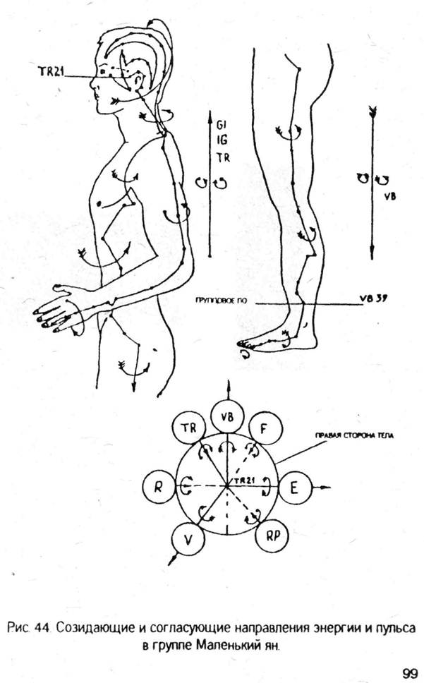 4.8. Разновидность вы видите на рис. 44. Набазе Маленького яна показано выключение энергии в Освежающем ине. Здесь мы дополняем принцип зеркальности согласованием инь-ян, гармоничностью. 4.9. Так появляются вариации. Двенадцать меридианов, четыре группы по три меридиана, шесть групп по два меридиана. Насыщающий инь и Раскрывающий ян требуют гармоничности телесных движений согласно движениям энергетических потоков. Танец Шивы является гармонией, выражающейся в телесных движениях согласованных с энергетическими переходами во внутреннем Космосе. 4.10. В заключение подчеркнем роль и особенность точек "у-шу" (Глава 2). В Радостном яне и Освежающем ине нарастание энергетической мощи соответствует ходу меридиана. В яне Трех Богатырей и Солнечном ине последовательность "у-шу" противонаправлена ходу энергии в меридианах. Это имеет то значение, что Радостный ян включает режим ян, а Освежающий -режим инь в организме. Это исходные служители инь- и ян- состояний, их "ускорители". В отличие от этого Солнечный инь позволяет точками "у-шу" усилить или ослабить уровень насыщения. То же самое можно сказать и о яне Трех Богатырей. Например, потягиваясь утром и, тем самым, на руках, ускоряя ян, вы изгибаете кисти рук выключая точки "у-шу" Солнечного иня, насыщая энергетический потенциал, вы, наоборот, кулаки "собираете" к центру. Так достигается уровень биоэнергетических движений и Танца Шивы, которые лягут в основу формирования биоэнергетического интеллекта и созидания многополярного пространства. Об этом в последующих частях "Введения в многополярность".