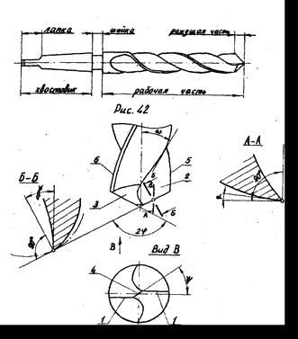 Сверление - процесс образования отверстий в сплошном материале, является весьма распространенным методом обработки металлов резанием. Рассверливание - расширение ранее образованного отверстия. Инструментом для образования отверстий служит сверло. По конструкции сверла подразделяютсяна перовые (плоские); спиральные; кольцевые - пустотелые сверлильные головки с закрепленными резцами для сверления отверстий большого диаметра; пушечные (ружейные) для сверления глубоких отверстий, Наиболее распространенным инструментом для сверления и рассверливания является спиральное сверло (рис.42), состоящее из хвостовика с лапкой, соединенных шейкой с рабочей частью, на которой находится непосредственно режущая часть. Спиральные сверла имеют 2 винтовые канавки на рабочей части, расположенные под углом: 180° друг к другу. Хвостовик для сверл малого диаметра выполняется в виде цилиндра без лапки и шейки, а для сверл большого диаметра - в виде пологого конуса (конус Морзе) (для ручного сверления с помощью трещоток хвостовик изготовляется четырехгранным суживающимся). Режущая часть сверла изготовляется из инструментальных материалов; быстрорежущих сталей Р9, Р18, Р9К5, 9ХС. Применяют сверла и с наплавленными пластинками из твердых сплавов, например, Т5К10 (для обработки сталей), ВК6 (для обработки чугунов). Рабочая часть сверла (рис.43) состоит из двух главных режущих лезвий (I), образованных пересечением передних (2) и задних (3) поверхностей. Они выполняют основную работу резания; 4 - поперечное режущее лезвие (перемычка); 5 - два вспомогательных режущих лезвия; 6 - две ленточки на цилиндрической части сверла. Сверло может быть рассмотрено как комплекс двух резцов. К основным геометрическим параметрам режущей части сверла относятся: