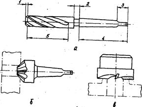При обработке отверстий сверлами из быстрорежущей стали можно получить 11-12 квалитет точности и 3÷4 класс чистоты (шероховатость поверхности R z80÷ R z40). При более высоких требованиях к точности и шероховатости отверстий применяют зенкерование и развертывание отверстий. Зенкерование может дать 8-11 квалитет точности и 6 класс чистоты (шероховатостьR a = 2,5), а развертывание - 6÷9 квалитет точности и до 9 класса чистоты (R a = 0,32). Инструменты, применяемые при зенкеровании, называются зенкерами, а при развертывании - развертками. Зенкерование, в зависимости от предъявляемых требований к обрабатываемой поверхности, может быть операцией промежуточной под последующее развертывание или окончательной операцией при зенкеровании ранее просверленных, отлитых или прошитых отверстий. (в любом случае зенкерование - это обработка ранее образованного отверстия, кроме цекования). При разработке технологических процессов обработки отверстий разных квалитетов точности и шероховатости поверхности, Пользуются следующими общимисхемами: 1) 12 квалитет точностии R z80( 2) 11 квалитет точностии R z40( 3) 8-9 квалитет точности иR а5 ( 4) 6 квалитет точности и R а 2,5 ( Зенкеры (рис.45) выпускают двух видов; цельные (а), с тремя режущими зубьями, и насадные (в)(от 32мм и выше) с четырьмя режущими зубьями. Цельные зенкеры крепятся в шпинцеле станка своими коническими (конус Морзе) хвостовиками, а насадные - на специальную оправку, также имеющую конический хвостовик. Зенкеры могут изготовляться из быстрорежущей стали, а также с напаяными пластинками из твердых сплавов. При обработке стали применяют пластинки из сплава Т15К6, при обработке чугуна - из сплавов ВК4, ВК6, ВК8. При этом материал корпуса выполняют из инструментальной стали 9ХСили У7.