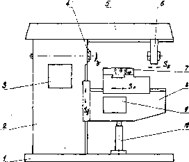 Горизонтально-фрезерный станок (рис.55) предназначен для обработки вертикальных и горизонтальных плоскостей, пазов, углов, для нарезания зубчатых колес и т.п. цилиндрическими, дисковыми, фасонными, угловыми, торцовыми фрезами. Рис. 55 Станок состоит из фундаментной плиты I, станины коробчатой формы 2, на которой смонтированы все основные узлы стояка. В станине размещается коробка скоростей 3. По вертикальным направляющим станины перемещается консоль 8. Заготовка, устанавливаемая на стол 7 в машинных тисках или приспособлении, может получать подачу в трех направлениях: продольном (перемещение стола по направляющим типа ласточкина хвоста) (Sпр); поперечном (перемещение по направляющим консоли) (Sп) и, вертикальном (перемещение консоли по направляющим станины) (Sв). Главным движением является вращение шпинделя (v). Внутри консоли размещена коробка подач 9. Вверхней частистанины расположен хобот 5. По его направляющим перемещается подвеска, 6 с подшипником для поддержания второго конца длинной оправки с фрезой.