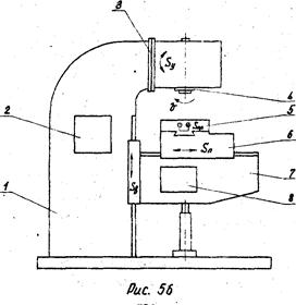 Вертикально-фрезерный станок (рис.56) предназначен для обработки вертикальных, горизонтальных и наклонных плоскостей, пазов, углов, рамок зубчатых колес и т.п. торцовыми, концевыми, цилиндрическими, фасонными и др. фрезами. Вертикально-фрезерные консольные станки имеют много общих унифицированных деталей и узлов с горизонтально-фрезерными консольными станками. В станине 1 размещена коробка скоростей 2. Шпиндельная головка 3 смонтирована в верхней части станины и может поворачиваться в вертикальной плоскостиSу. При этом ось шпинделя 4, можно поворачивать под углом к плоскости рабочего стола 5. Главным движением является вращение шпинделя (v). Стол, на котором закрепляют заготовку, имеет продольное перемещение (Sпр) по направляющим салазок 6. Салазки имеют поперечное перемещение (Sп) по направляющим консоли 7, которая перемещается по вертикальным направляющим станины (Sв). Таким образом, заготовка, установленная на столе, может получать подачу в трех направлениях. В консоли смонтирована коробка подач 8. Для установки заготовок на фрезерных станках применяются следующие приспособления: поворотные тиски (машинные), делительные головки и специальные установочные приспособления. В качестве вспомогательного инструмента применяют фрезерные оправки для закрепления фрез и передачи крутящего момента, от шпинделя станкана фрезу.