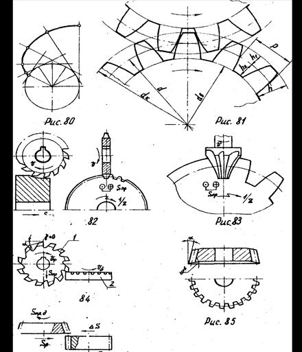 Рис. 86 В машиностроении часто используются реечные передачи для преобразования вращательного движения в поступательное и наоборот. Реечные передачи различных типов получаются из зубчатых при обращении одного колеса в рейку. Зацепление зубчатых колес может быть наружным или внутренним. Ввиду больших скоростей и больших удельных давлений, применяемых в современных машинах, изготовление шестерен (зубчатых колес) представляет собой сложную технологическую задачу, а процесс изготовленияих достаточно трудоемок. Для создания плавного зацепления и равномерной передачи движения применяют эвольвентный профиль зубчатого зацепления, предложенный более 200 лет назад русским академиком Леонардом Эйлером. Эвольвента - траектория точки прямой, катящейся по окружности без скольжения (рис.80). Основными параметрами зубчатого колеса являются (рис.81): - диаметр вершин зубьев зубчатого колеса - dx; - диаметр впадин зубьев колеса –dв; - диаметр делительной окружности зубчатого колеса – d, на котором толщина зуба и ширина впадины равны. Делительные диаметры сопряженной пары зубчатых колес соприкасаются в точке, лежащей на прямой, соединяющей центрыих осей, и катятся один по другому без скольжения; - окружной шаг Р - это толщина(мм) одного зуба вместе с впадиной,измеренная по делительной окружности; - модуль зацепления