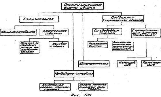СБОРКА В МАШИНОСТРОЕНИИ Процесс сборки является завершающим, наиболее ответственным этапом в изготовлении машины. Он может выполняться различными методами и в различных организационных формах, в зависимости от типа производства, габаритов изделий и других факторов. Каждое изделие (машина) состоит из отдельных конструктивных элементов - деталей и узлов различной сложности. Деталь - элементарная конструктивная часть машины, характеризующаяся отсутствием соединений. Подузел - простейшее соединение нескольких деталей. Узел - сборочное соединение, которое может собиратьсяили из отдельных деталей или из нескольких подузлов с добавлением отдельных деталей. Характерной особенностью узла является его технологическая законченность, позволяющая производить узловую сборку независимо от общей сборки. Механизм или агрегат - сборочное соединение, которое может собираться из отдельных узлов с добавлением некоторых деталей. Характерной его особенностью является конструктивная законченность, позволяющая ему функционировать вне зависимости от собираемой машины. Например: редуктор. Технологическим процессом сборки называется совокупность сборочных операций, производимых для соединения отдельных деталей подузлов, узлов и механизмов в готовое изделие. Сборочной операцией называется часть технологического сборочного процесса, выполняемая над одной сборочной единицей на одном рабочем месте одним рабочим или бригадой рабочих. Операция состоит из отдельных переходов. Переход - часть операции, выполняемая над определенным соединением при неизменном инструменте. Технологический процесс сборки изделия состоит из нескольких последовательно выполняемых этапов (стадий): 1 - ручная слесарная доводка деталей, которая допускается только в единичном и мелкосерийном производстве (подгонка деталей, зачистка заусенцев, снятие фасок и т.п.); 2 - предварительная (узловая) сборка, во время которой детали соединяются в сборочные единицы: поду злы, узлы и механизмы; 3 - общая (окончательная) сборка всего изделия; 4 - регулировка и испытание изделия (установка и выверка правильности взаимодействия частей машины). Соотношение по трудоемкости этапов сборки зависит от типа производства.