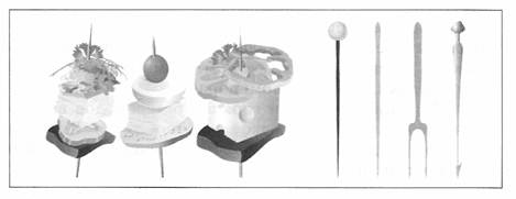 Бутерброды подают к столу на тарелках или сервировочных блюдах, располагают их в один слой. Маленькие канапе подают с палочками-шпажками (рис. 4), с помощью которых берут бутерброд. Бутерброды большего размера можно брать с общего блюда руками или лопаточкой. Горячие и большие по размеру бутерброды едят с помощью вилки и ножа.