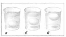 Способы определения доброкачественности яиц 1. Просвечивание. У свежего яйца белок легко просвечивается, а желток заметен слабо; недоброкачественные яйца не просвечиваются. 2. Погружение в воду. В стакан наливают воду и растворяют 1 столовую ложку соли, осторожно опускают туда яйцо. Качество определяют по положению яйца (рис. 5).