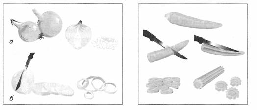 Рис. 10. Нарезка лука: Рис. 11. Фигурная нарезка моркови а — кубиками; б — кольцами