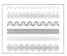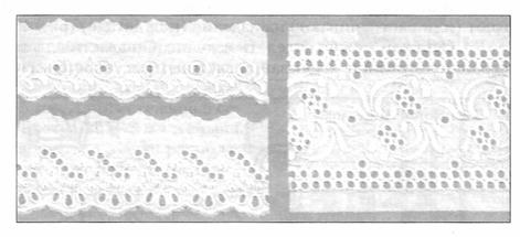 Рис. 58. Шитье Шитье выпускают в виде края (с зубцами), прошивок и полотен; его применяют для отделки блузок, платьев, белья. Ширина шитья зависит от его вида. Для отделки фартука используют шитье в виде края (с зубцами).