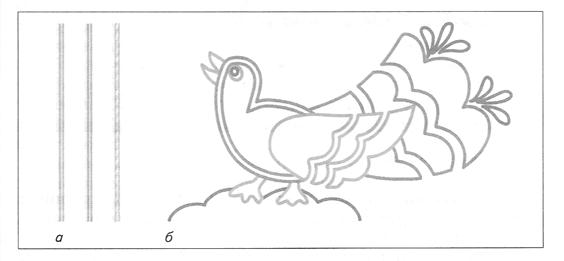 Фартук можно отделать тесьмой, настрочив ее по краям карманов, нагрудника и основной детали фартука. Для этого нужно наложить тесьму на деталь по намеченной линии, наметать на расстоянии 3 мм от края, настрочить тесьму по одной из ее сторон или по двум сторонам на расстоянии 1 мм от края. Сутаж — это отделочный шнур, состоящий из двух прядей хлопчатобумажной пряжи, оплетенных вискозными нитями. В центре сутажа есть углубление, по которому его наметывают (или настрачивают) на изделие (или деталь) (рис. 57, а). Сутажом можно отделать изделие. Он эластичен, поэтому его используют для вышивания сложных рисунков (рис. 57, б).