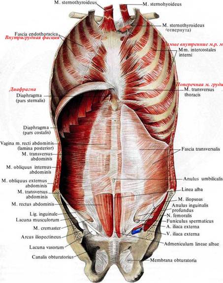 Мышцы и фасции туловища; вид изнутри. (Передняя стенка груди и живота.)