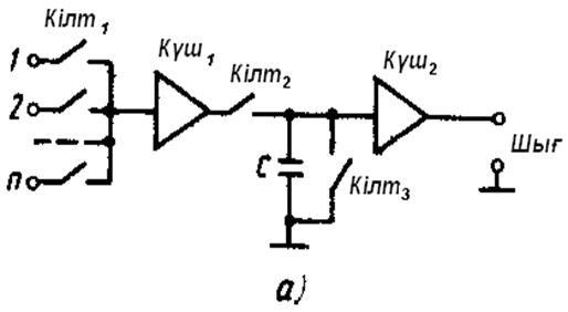 Схема содержит электронные ключи, накопительный конденсатор и операционные усилители. Ключи КЛ 1 на входе являются амплитудно-импульсными модуляторами каналов и включаются поочередно, их число равно числу каналов. Ключ КЛ 2работает одновременно с КЛ 1и подключает на короткое время заряда т3 накопительный конденсатор, который заряжается до уровня амплитуды АИМ сигнала. Для уменьшения времени заряда конденсатора усилитель Усил 1 имеет достаточно малое выходное сопротивление. КЛ 1 и Кл 2 размыкаются. Усилитель Усил 2 имеет высокоомное входное сопротивление, что обеспечивает практически постоянное значение напряжения, заряда конденсатора на весь период квантования и кодирования сигнала.