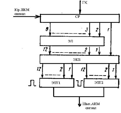 Декодер преобразует ИКМ сигнала в АИМ сигнал, т, е. в отсчеты нужной полярности и амплитуды. Принцип построения нелинейного декодера взвешивающего типа с цифровым экспандированием эталонов поясняется на рис. 3.15. Декодер содержит цифровой регистр ЦР, блок экспандирующей логики ЭЛ, блок выбора и коммутации эталонных токов БКЭ и два генератора эталонных токов положительной ГЭТ] и отрицательной ГЭТ2 полярностей^ Восьмиразрядная кодовая группа принятого ИКМ сигнала записывается в ЦР, формируясь на его выходах 1...8 в виде параллельного 8-разрядного двоичного кода. Первый разряд этой кодовой комбинации определяет полярность включаемого ГЭТ, а 2...8-й разряды — номер сегмента и уровня квантования на характеристике экспандирования. В соответствии с принятой кодовой комбинацией включаются соответствующие эталоны, суммарный ток которых определяет величину (амплитуду) декодированного отсчета АИМ сигнала. Как отмечалось ранее, для уменьшения искажений при декодировании используется еще 12-й корректирующий эталон, равный значению 0,5 шага квантования сегмента.