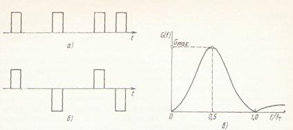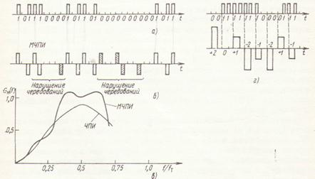 На рис. 4.4, а представлена двоичная кодовая комбинация, а на рис. 4.4 б полученная из нее комбинация в коде ЧПИ. Видно, что символы, используемые в комбинации кода ЧПИ, могут иметь три уровня: —1; 0; +1. В то же время количество информации в кодовой комбинации ЧПИ такое же, как и в двоичном коде, так как она получена из двоичной комбинации. Количество информации в кодовой комбинации, состоящей из элементов трех уровней, больше, чем в двоичной. Избыточность информации при использовании кода ЧПИ позволяет контролировать наличие ошибок в линейном тракте. Энергетический спектр случайной импульсной последовательности (рис. 4.4, в) концентрируется в узкой области вблизи частоты 0,5/т, называемой полутактовой. В спектре сигнала отсутствует составляющая с частотой /т, что затрудняет построение систем тактовой синхронизации. Тем не менее отсутствие постоянной составляющей и концентрация спектра в области частот ниже /т позволяют при одинаковых значениях тактовой частоты получить для сигнала с ЧПИ меньшие, чем для двоичного, величины межсимвольных искажений и переходной помехи. Это и определило широкое использование сигнала с ЧПИ в низкоскоростных и средне-скоростных ЦСП.