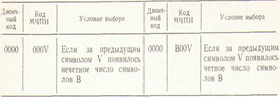 Сигнал с ЧПИ обладает одним существенным недостатком — при отсутствии передачи по части каналов в сигнале появляются длинные серии 'Пробелов (нулей). В данном случае возможен сбой •системы тактовой синхронизации. Чтобы этого не происходило, следует ограничить в коде ЧПИ число подряд следующих нулей. Эта задача была решена созданием кодов с высокой плотностью единиц (КВП). Наибольшее распространение получил код КВП-З в комбинациях которого допускается не более трех нулей между двумя соседними единицами. Этот код еще называют модифицированным квазитроичным кодом МЧПИ. Код МЧПИ может быть получен из двоичного по определенному алгоритму, предусматривающему чередование полярности импульсов В двоичного кода, разделенных не более чем тремя нулями. Если число нулей между двумя импульсами В двоичного кода