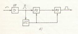Структура регенератора представлена на рис. 1 а. Искаженный цифровой сигнал из кабельной цепи поступает на усилитель-корректор УК, обеспечивающий частичную или полную коррекцию формы импульсов, и регистрируется решающим устройством РУ. Решающее устройство представляет собой пороговую схему, которая срабатывает, если уровень сигнала на его входе превышает пороговый уровень РУ, и не срабатывает, если уровень входного сигнала меньше уровня порога. Пороговое напряжение может подаваться извне или вырабатываться в схеме РУ. При поступлении импульса на выходе РУ появляется управляющий сигнал, а в случае 0 (пробела) состояние РУ не изменяется. Формирующее устройство ФУ обеспечивает формирование по сигналам РУ импульсов с принятыми для конкретной системы стандартными параметрами^ Верность принимаемых РУ решений зависит, в первую очередь, от способа обнаружения двоичного сигнала и качества работы УТС. При безошибочной работе РУ каждому входному импульсу соответствует выходной, а каждому «пробелу» на входе - - «пробел» на выходе. Однако из-за присутствия на входе РУ различных помех, несовершенства устройства тактовой синхронизации и других причин в процессе регенерации возможны ошибки, выражающиеся в преобразовании 1 на входе регенератора в 0 на выходе и наоборот входного 0 в выходную 1. Рассмотрим временные диаграммы, поясняющие принцип регенерации цифрового сигнала (рис. 4.8). Входной сигнал, пройдя регенерационный участок (рис. 1.б), искажается, форма его изменяется и на входе УК (рис. 1, в) она уже сильно отличается от исходной. Усилитель-корректор, устраняя амплитудно-частотные искажения цепи, корректирует форму импульсов, обеспечивая более крутые фронты, что облегчает процесс принятия решения в РУ. Форма сигнала на входе РУ представлена на рис. 1, г, здесь же штриховой линией, показан пороговый уровень РУ. На рис. 1, д показаны сигналы тактовой синхронизации. Из рисунка видно, что сигналы УТС размещаются в центрах тактовых интервалов, на которых входные сигналы РУ имеют максимальное значение и наименее искаженную форму, т. е. обеспечивается максимальное превышение сигнала над помехой, а следовательно, и верность регистрации. Из рисунка также ясно, что смещение синхросигнала может привести к ошибке регенерации. Не исключается ошибочное решение и при правильном расположении тактовых синхроимпульсов. Такой случай возможен, если полярность помехи противоположна полярности импульса, а ее абсолютная величина больше порогового значения. Тогда уровень импульса, искаженного помехой, будет ниже порогового уровня, что при регенерации приведет к ошибке. Если при отсутствии импульса уровень помехи окажется выше порогового, это также приведет к ошибке.