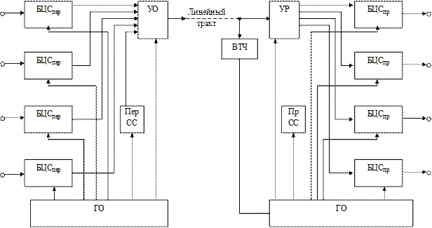 Асинхронное объединение Синхронное объединение Объединение цифровых потоков осуществляется в оборудовании временного группообразования, принцип построения которого показан на рис. 3. В состав оборудования входят: - блоки цифрового сопряжения тракта передачи и приема БЦСпер, БЦСпр; - устройства объединения УО в тракте передачи; - разделения УР в тракте приема потоков; - передатчик Пер.СС - приемник синхросигнала Пр.СС; - выделитель тактовой частоты ВТЧ; - генераторное оборудование ГО передающей и приемной станции.