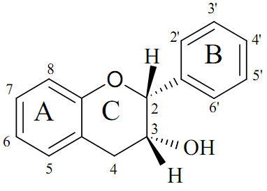 Дигидрофлавонолы (флаванонолы) Отличаются от флавонола отсутствием двойной связи между углеродами во 2-м и 3-м положениях. ОН-группа, как и у флавонола, находится в 3-м положении, подобно катехинам, содержащих два асимметрических атома углерода в молекуле (С2 и С3): Большинство флаванонолов выделено из древесины хвойных (сосна, ель, лиственница) или лиственных пород (эвкалипт, бук, вишня). В растениях они содержатся в виде агликонов или 3-гликозидов. Флаванонолы — лабильные соединения, накапливающиеся в растениях в небольших количествах. При нагревании водных растворов они легко переходят в соответствующие флавонолы. Возможные предшественники других групп флавоноидных соединений.