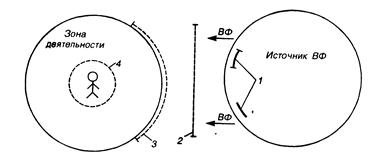 1–устройства, входящие в состав источника воздействий; 2–устройства, устанавливаемые между источником и зоной деятельности; 3–устройства для защиты зоны деятельности; 4–средства индивидуальной защиты человека