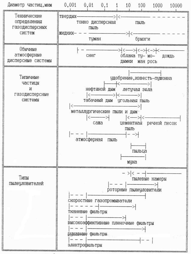 Рис. 12. Схема соответствия возможностей средств ПГО гранулометрическому составу пыли К группе средств механической очистки также относятся аппараты, в которых удаление примесей обеспечивается центробежными силами, - гидроциклоны и центрифуги. Так, для удаления нефти и всплывающих веществ применяются открытые гидроциклоны (Vс < 0,2 м/с), а для удаления химических веществ - центрифуги. Фильтры для очистки СВ делятся на медленные (через пленку) и скоростные (через слой загрузки). Конструктивно они выполняются в виде металлических сеток с перегородками из ткали, стекловолокна, асбеста, керамики. В зернистых фильтрах в качестве слоя загрузки используют кварц, песок, шлак. В медленных зернистых фильтрах Vс = 0,1...0,2 м/с, концентрация примесей 25...50 мг/л и высокая эффективность очистки; в скоростных фильтрах h слоя загрузки 0,5...2 мм, Vс = 15...20 м/с. Регенерация зернистых фильтров проводится обратным током воды. В микрофильтрах барабанного типа диаметр ячеек 40...70 мкм, Vс = 25 м/с, эффективность очистки 50...60%. В машиностроении для удаления ферромагнитных примесей применяют магнитные сепараторы с Vс = 50 м/с и эффективностью очистки до 90%. Для очистки от масел и жиров используется вспененный полиуретан, при этом Vс = 0,01 м/с и эффективность очистки достигает 90%. Регенерация полиуретана легко обеспечивается отжиманием на валках. Из физико-химических методов очистки наибольшее распространение получили флотация, ионообименнфя очистка, адсорбция и экстракция. Флотация основана на прилипании гидрофобных частиц к пузырькам воздуха. Выделение воздуха из воды обеспечивается ваку-умированием до 225...300 мм рт.ст., механическим диопергированием воздуха импеллерами, пенно-барботажными устройствами, напорной, химической и биологической флотацией. Установки для флотации включают емкости для насыщения СВ воздухом (при напорной флотации) или аэраторы и другие флотационные камеры при прочих способах получения пузырьков, а также собственно флотаторы. Флотация применяется для очистки от нерастворимых диспергированных ВВ и ПАВ. Ионообменная очистка обеспечивает удаление Zn, Cu, Cr, Ni, Pb, Hg, Cd, As и РВ за счет обмена ионами с твердой фазой естественных ионитов (цеолитов, слюды, шпата) и синтетических (силикагелей, перматитов) и органических ионообменных смол (гуминовых кислот, сульфоуглей). Установки для такой очистки представляют собой листы или плиты из ионообменных материалов, расположенные перпендикулярно движению СВ. Экстракция заключается в разделении жидких или твердых веществ с помощью растворителей (экстрагентов). Она применяется для очистки СВ от фенолов, масел, органических кислот с концентрацией до 4 г/л. Конструктивно устройство для экстракции представляет собой смеситель и отстойник. Устройства для адсорбации аналогичны адсорберам для очистки выбросов (см. п.п. 2.3.2). Из химических и электрохимических методов очистки широкое распространение получили реакции нейтрализации, окисления и восстановления, а также коагуляция и флокуляция. Наиболее выгодна нейтрализация смешиванием кислых и щелочных СВ, а при ее невозможности нейтрализация обеспечивается добавлением реагентов, хемосорбций и фильтрацией через нейтрализующие материалы. Для реакции окисления применяются N2O2, KMnO4, O3 и др. Применение О3 или озонирование эффективно при обезвреживании цианидов и тяже