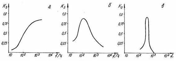 Рис. 13. Частотная характеристика пористых(а) и мембранных (б) звукопоглотителей и объемных резонаторов (в), Кз – коэффициент звукопоглощения Для акустической обработки помещений с высокими требованиями к их акустике (например, сурдокамер) применяют штучные звукопоглотители в виде кубов, конусов, параллелепипедов, а также звукопоглощающие кулисы. Снижение уровня шума при этом составляет 5...8 дБ. Более эффективным являются звукоизолирующие конструкции, представленные акустическими экранами, звукоизолирующими кожухами и ограждениями. Звукоизолирующие кожухи изготовляют из стали, дюралюминия, пластмасс. Они полностью закрывают источник шума и снижают интенсивность низкочастотного шума на 20...30, а высокочастотного на 40...50 дБ. Высокими звукоизолирующими свойствами обладают практически все строительные конструкции. Кирпичные и бетонные перекрытия, стены и перегородки снижают шума на 40...50 дБ. Их изолирующая способность пропорциональная толщине конструкции и ее поверхностной плотности, а при массивных стенах шум удается снизить на 55...60 дБ. Частотная характеристика строительных конструкций зависит также от их формы - плоской или цилиндрической. Наиболее уязвимым местом при звукоизоляции являются оконные проемы, вентиляционные отверстия и воздуховоды, для звукоизоляции которых в последнее время разработаны высокоэффективные пленочные материалы. При невозможности снижения уровня шума с помощью звукоизолирующих кожухов (при размещении источника шума и РМ в одном помещении) применяются акустические экраны, т.е. преграды ограниченных размеров между источником шума и РМ. Их применение рекомендовано в случае превышения не менее чем на 10 дБ шума экранируемого источника сравнительно с шумом от других источников. Кроме того, эффективность таких экранов резко уменьшается при длительной (более 4с) реверберации, т.е. многократном отражении звука от ограждающих конструкций. Линейные размеры экрана должны не меньше чем в 3 раза превышать размеры источника. Наиболее целесообразной для этих экранов является П-образная форма. Глушители шума подразделяются на активные, реактивные и комбинированные. Первые представляют собой трубы круглого или прямоугольного сечения, облицованные звукопоглощающим материалом, или наборы звукопоглощающих пластин, установленных в воздуховодах параллельно или перпендикулярно направлению движения воздуха, или перфорированные металлические цилиндры, заполненные керамзитовой крошкой. Активные глушители применяют в компрессорах, вентиляторах и газотурбинных установках. Реактивные глушители - это внезапное расширение участка трубопровода, рассчитанного для заданных частоты и скорости звука, боковые или концентрические резонаторы и экранные глушители на выходе из канала в атмосферу или на входе в канал. Кроме того, существуют и комбинированные глушители (например, экранные или камерные со звукопоглощающей облицовкой). Для защиты от инфразвука применяются интерференционные глушители, выполенные в виде отводов в воздухопроводах, смещающих волну звука по фазе, и глушители камерного или резонаторного типа. Недостатком последних являются большие размеры (из-за большой длины волн инфразвука). Средства защиты от ультразвука те же, что и от высокочастотного шума. СЗ от вибраций включают средства ви