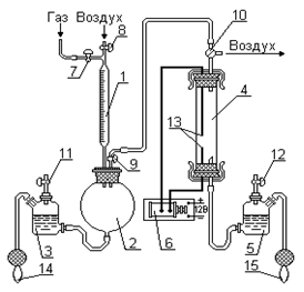 1 – мерный цилиндр; 2 – смеситель; 3, 5 – аспираторы; 4 – взрывной цилиндр; 6 – высоковольтный индуктор; 7 – газовый кран; 8, 11, 12 – воздушные краны; 9 – кран; 10– трехходовой кран; 13 – электроды; 14, 15 – резиновые груши Рисунок 4.2 – Схема модельного стенда для определения НКПРП газовоздушной смеси