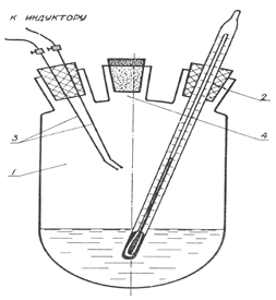 1 – реакционная колба; 2 – термометр; 3 – электроды; 4 – корковая пробка Рисунок 6.1 – Схема прибора ТП Прибор выполнен в виде стеклянного сосуда (1), изготовленного из молибденового стекла, с тремя горловинами, в одну из которых вставлена пробка с термометром (2) для замера температуры жидкости в сосуде. Две другие служат для искровых электродов (3) и заливки исследуемой жидкости.