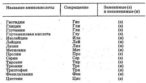 ■■ Двадцять амінокислот, залишки яких входять до складу білків, названі основними, щоб відрізнити їх від інших, присутніх в організмах, але не вхідних до складу білків. Основні амінокислоти для скороченого запису позначають трьома буквами (див. таблицю). Розроблено класифікацію амінокислот, в основу якої покладена можливість їхнього синтезу в організмі людини - замінні й незамінні. Перші з них утворяться в організмі людини, а другі - попадають у нього тільки з харчовими продуктами. Їх синтезують рослини, гриби, бактерії. Будова білків Як ми вже відзначали, особливістю амінокислот є одночасна наявність карбоксильных і аминогрупп, що має відповідно кислотні й лужні властивості. Тому амінокислоти - амфотерні з'єднання (тобто об'єднуючі властивості кислот і лугів). Цим обумовлена здатність амінокислот до взаємодії. Скорочені позначення амінокислот (не для запам'ятовування)
