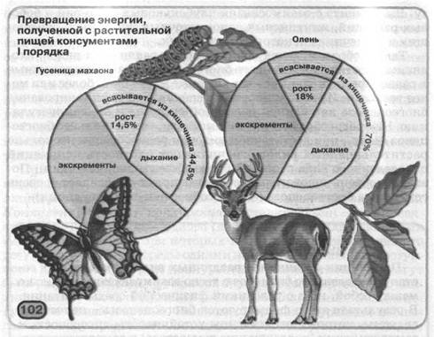 ных організмів (мал. 102). Те ж саме спостерігається й при поїданні растительноядных видів хижаками. Таким чином, на кожному етапі передачі енергії від одних організмів іншим більша її частина розсіюється у вигляді тепла й тільки незначна частина запасається у вигляді потенційної енергії хімічних зв'язків з'єднань, синтезованих у ході пластичного обміну. Послідовності організмів, у яких особини одного виду, їхні залишки або продукти життєдіяльності служать об'єктом харчування для організмів іншого виду, називають ланцюгами харчування (мал. 103). Кожний ланцюг харчування складається з певної кількості ланок (тобто певної кількості видів організмів). Положення організмів певного виду в ланцюзі харчування визначає його трофічний рівень. В основі ланцюгів харчування, як правило, перебувають продуценти (автотрофні організми). Трофічний рівень консументов (гетеротрофних організмів) визначається кількістю ланок, через які вони одержують енергію від продуцентів. Так, растительноядные тварини займають наступний після продуцентів трофічний рівень (консумеЛты I порядку), далі йде рівень хижаків, що поїдають растительноядные види (консументы II порядку) і т.д. Якщо консументы мають широкий спектр харчування, то в різних ланцюгах харчування вони зані- томлять різні трофічні рівні. Наприклад, сіра ворона може харчуватися зерном (консумент I порядку до пташенятами зерноядных (консумент II порядку) або комахоїдних (консумент III порядку) видів птахів. Частина біомаси загиблих продуцентів, не утилізована консументами (напр., листяний опад), залишки або продукти життєдіяльності консументов (напр., трупи, екскременти тварин), становлять кормову базу редуцентов. Редуценты одержують необхідну їм енергію, розкладаючи в кілька етапів органічні сполуки до неорганічних. Таким чином, енергія в біогеоценозі акумулюється у вигляді хімічних зв'язків органічних сполук, синтезованих продуцентами з неорганічних речовин за рахунок сонячної енергії, а потім проходить через організми консументов і редуцентов. При цьому на кожному трофічному рівні енергія частково розсіюється у вигляді тепла. Енергія, що збереглася в мертвій органічній речовині, остаточно розсіюється при його руйнуванні редуцентами. Оскільки при передачі енергії з одного трофічного рівня на іншій, більше високий, більша її частина втрачається для організмів, то кількість можливих ланок ланцюга харчування обмежено. Як правило, воно не перевищує п'ять^-п'ятьом-п'яти-п'ятьох-чотирьох-п'яти. Тому що при передачі енергії від нижчого трофічного рівня на більше високий більша її частину розсіюється у вигляді тепла, круговорот енергії в біогеоценозі, на відміну від круговороту речовин, неможливий: для нормального функціонування біогеоценозу необхідно постійне надходження певної кількості енергії ззовні, що компенсує її втрати живими організмами. Таким чином, основу будь-якого біогеоценозу становлять зелені рослини, здатні вловлювати енергію сонячного світла й переводити її в енергію хімічних зв'язків синтезованих ними органічних сполук. Тому мешканці морського дна, печер і інших місцеперебувань, куди не доходить сонячне світло, не є окремими біогеоценозами. Вони - тільки частини біогеоценозів, що функціонують за рахунок надходження органічної речовини з тих частин, де є продуценти. Тип