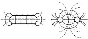 Электрическое поле, так же как и гравитационное является потенциальным, то есть работа, совершаемая по перемещению заряда в нем не зависит от формы пути, а определяется разностью потенциалов между конечной и начальной точками и при перемещении по замкнутому контуру она равна нулю. Если поле создается некоторой совокупностью электрических зарядов, то потенциал в любой точке определяется алгебраической суммой потенциалов создаваемых каждым зарядом, а напряженность поля равна геометрической сумме напряженностей. Это принцип суперпозиции (наложения) полей. Кроме силовых, поле может быть изображено с помощью эквипотенциальных линий. Они ортогональны силовым. Например, наглядное представление однородного поля и поля дипольного заряда будет (рис.15),