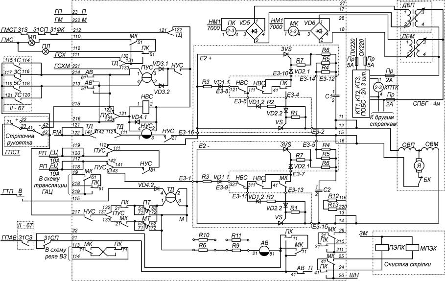 Рис. 8.3. Схема керування стрілочним електроприводом типу СПГБ-4М Стрілку можна перевести в мінусове положення вручну поворотом стрілочної рукоятки або автоматично у разі вмикання сортувальних реле (1С або 3С). У результаті цього одержують живлення реле НВС і НУС (по верхній обмотці 4-2). У колі вмикання даних реле перевіряються такі умови: вільність стрілочної ділянки (реле 31СП), відсутність замикання стрілки в маршруті (реле 31З), відсутність на ділянці вагона з довгою базою (фотоелектричний пристрій 31ФК), справність тиристорних комутаторів Е2(+) і Е2(-) (реле ТД). Через фронтовий контакт НУС вмикається реле ПУС (по верхній обмотці 1-3), що призводить до перемикання поляризованих контактів реле в положення, показане на схемі пунктирною лінією. Це приводить до розриву кола живлення реле НВС і НУС, але за рахунок уповільнення на відпускання вони будуть утримувати якір у притягнутому стані. Першим відпускає якір реле НВС, і поки реле НУС залишається ввімкненим на керуючий електрод тиристора VS комутатора Е2(-) надходить позитивний потенціал по колу: РП (119-120)–ПУС–НУС–ПУС– R 3– VD 1.1–НВС–НВС–МК– VD 2.2. Діод VD 1.2 виключає подачу цього потенціалу на катод тиристора VS. Тиристор VS відкривається, що приводить до вмикання електродвигуна по колу: РП (119-120) –ПУС–НУС–ПУС–тиристор VS –обмотка збудження ОВМ–НУС–обмотка реле НУС (1-3)–ТД–РМ (121-122). Із цього моменту до закінчення переведення стрілки реле НУС утримує якір у притягнутому стані струмом, що протікає по струмовій обмотці 1-3. Одночасно із цим відбувається заряд конденсатора С2 через резистори R 4 й R 5. По закінченні переведення й одержанні за контролю положення стрілки вмикається реле МК, що своїм контактом знімає з керуючого електрода тиристора VS позитивний потенціал і подає його на керуючий електрод замикаючого тиристора 3 VS. Він відкривається й розряджає конденсатор С2 назустріч струму відкритого тиристора VS, що приводить до закриття останнього, вимиканню двигуна й реле НУС. Тиристор 3 VS також закривається, оскільки через нього проходить струм, заданий резистором R 6 і недостатній для втримання його у відкритому стані. Діоди VD 1.1, VD 2.1 й VD 2.2 виключають подачу негативного потенціалу з конденсатора С 1 на керуючі електроди в момент відкриття тиристора 3 VS і закриття VS, що може призвести до пошкодження останнього. Якщо переведення стрілки затягується на час, більший ніж 1,8 с, то вимикається реле АВ і відбувається автоматичне повернення стрілки із середнього в початкове положення. Через контакти реле АВ спрацьовує реле НВС, а реле НУС уже перебуває під струмом по робочому колу вмикання двигуна. До початку перемикання якоря ПУС реле НВС встигне подати позитивний потенціал з конденсатора С 2 на керуючий електрод тиристора 3 VS схеми Е2(-) по такому колу: + С 2– R 2– VD 1.2–фронтовий контакт НВС– VD 2.1–керуючий вивід тиристора 3 VS –катод тиристора 3 VS – R 6– C 2. Це приводить до відкриття тиристора 3 VS і до закриття тиристора VS. Робоче коло електродвигуна розривається, і перемикання контактів ПУС відбувається вже, коли електродвигун вимкнений. Реле ПУС вмикається по колу нижньої обмотки 4-2, що приводить до перемикання його поляризованих контактів у положення, показане на схемі суцільною лінією. У результаті цього реле НВС відпускає якір і подає позитивний потенціал на керуючий електрод тиристора VS схеми Е2(+) по 